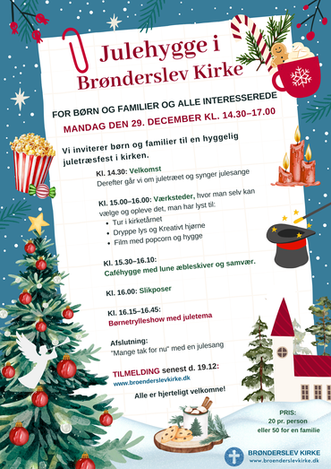 Juletræsfesten begynder kl. 14.30, hvor der skal danses om juletræet. Derefter er der forskellige værksteder, som man kan vælge sig ind på. Der er f.eks. mulighed for at dryppe lys og lave andre kreative aktiviteter. Der vil også være biografhygge, og skulle nogle af børnene have lyst til at komme en tur op i kirketårnet, kan det også lade sig gøre.